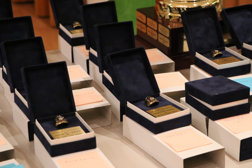 Prsteny pro vítěze extraligy v hokejbalu se tradičně předávaly v obřadní síni radnice Prahy 13