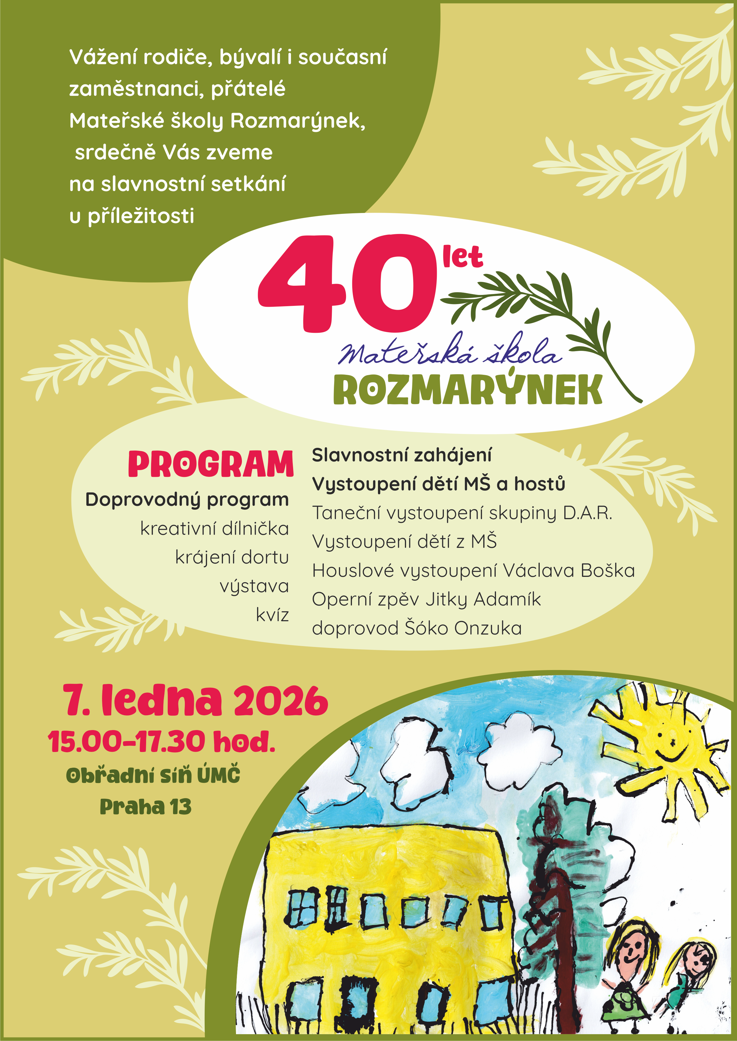 Srdečně zveme všechny přátele a příznivce MŠ Rozmarýnek na oslavu 40. výročí jejího založení.