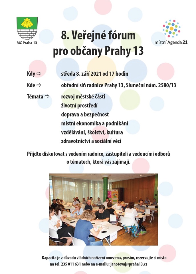 Městská část Praha 13 a místní Agenda 21 vás zvou na již 8. Veřejné fórum, které je určeno pro občany Prahy 13. Přijďte diskutovat s vedením radnice, zastupiteli a vedoucími odborů o tématech, které vás zajímají.