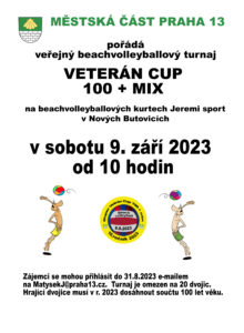 Městská část Praha 13 pořádá ve sportovním areálu v Nových Butovicích 10. ročník beachvolejbalového turnaje 100+. Turnaj je určen pro smíšené sportovní dvojice, kdy součet věku obou hráčů musí letos dosáhnout minimálně 100 let. Na turnaji může nastoupit maximálně 20 dvojic.