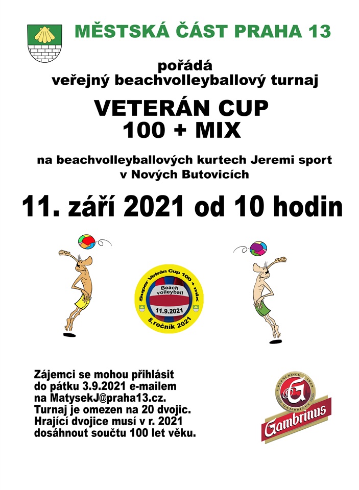 Městská část Praha 13 pořádá ve sportovním areálu v Nových Butovicích 8. ročník beachvolejbalového turnaje 100+ . Turnaj je určen pro smíšené sportovní dvojice, kdy součet věku obou hráčů musí letos dosáhnout minimálně 100 let. Na turnaji může nastoupit maximálně 20 dvojic.