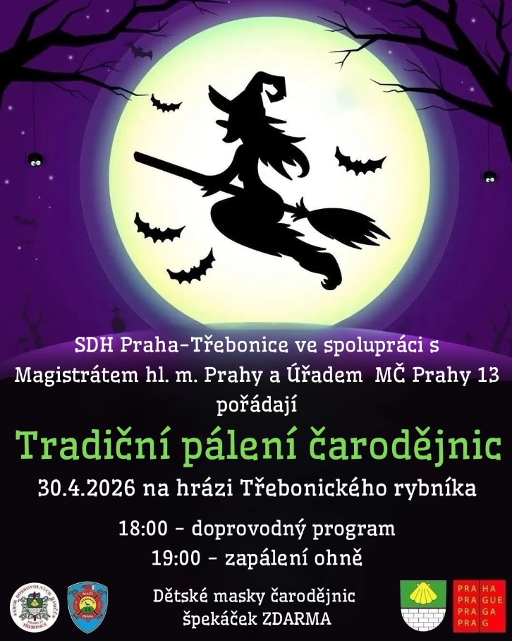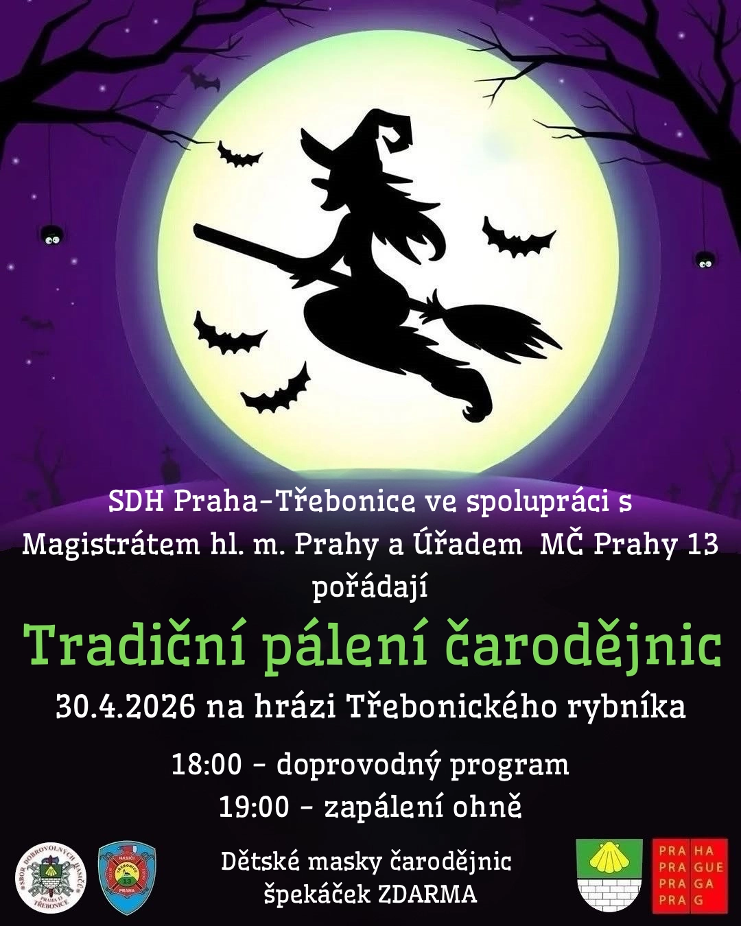 Hasiči Třebonice vás všechny zvou na již tradiční pálení čarodějnic. Od 18.00 do 19.00 jsou pro děti připraveny soutěže a ocenění masek. Zapálení ohně bude v 19.00.