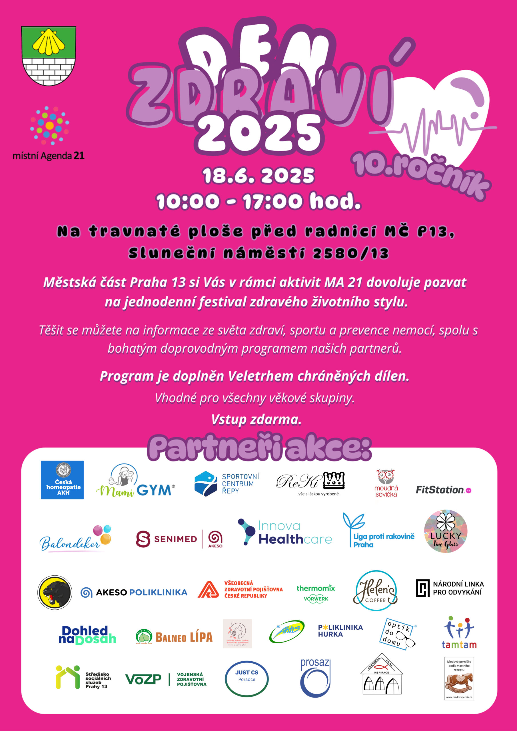 Městská část Praha 13 prostřednictvím místní Agendy 21 Vás srdečně zve na 10. ročník akce Den zdraví 2025. Akce je zaměřena na podporu zdraví a zdravého životního stylu a proběhne ve středu 18. června od 10.00 do 17.00 hodin. Připraven je pestrý program plný zajímavých aktivit, odborných informací a inspirativních workshopů, které se budou věnovat různým tématům zdraví a prevence. Celý program je doplněn Veletrhem chráněných dílen.