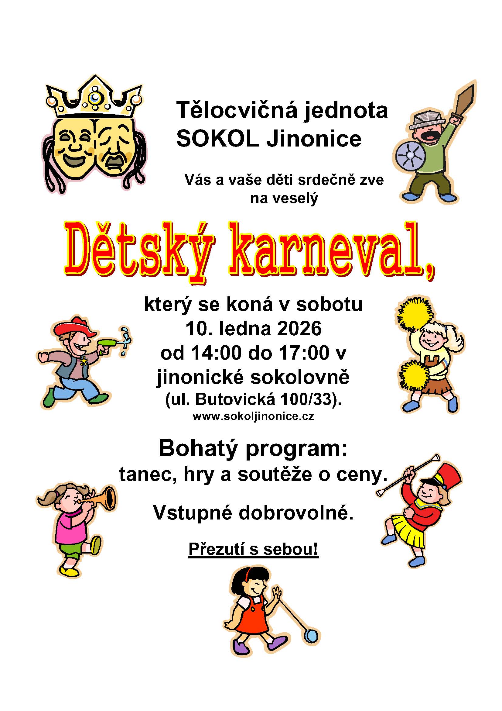 Tělocvičná jednota Sokol Jinonice vás a vaše děti srdečně zve na veselý Dětský karneval. Těšit se můžete na bohatý program: