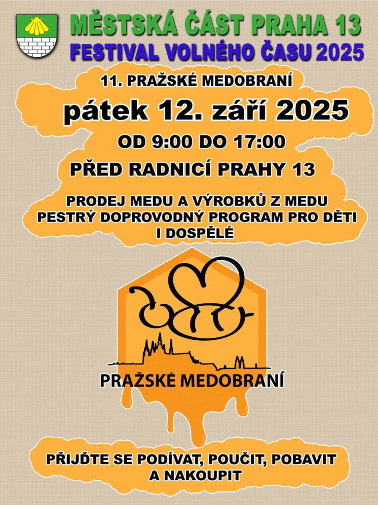 Před budovou radnice MČ Praha 13 na Slunečním náměstí bude opět velký jednorázový trh s medem, prodej medu a výrobků z medu, ochutnávka medů a medovin, pestrý doprovodný program nejen o včelách a medu pro děti i dospělé.