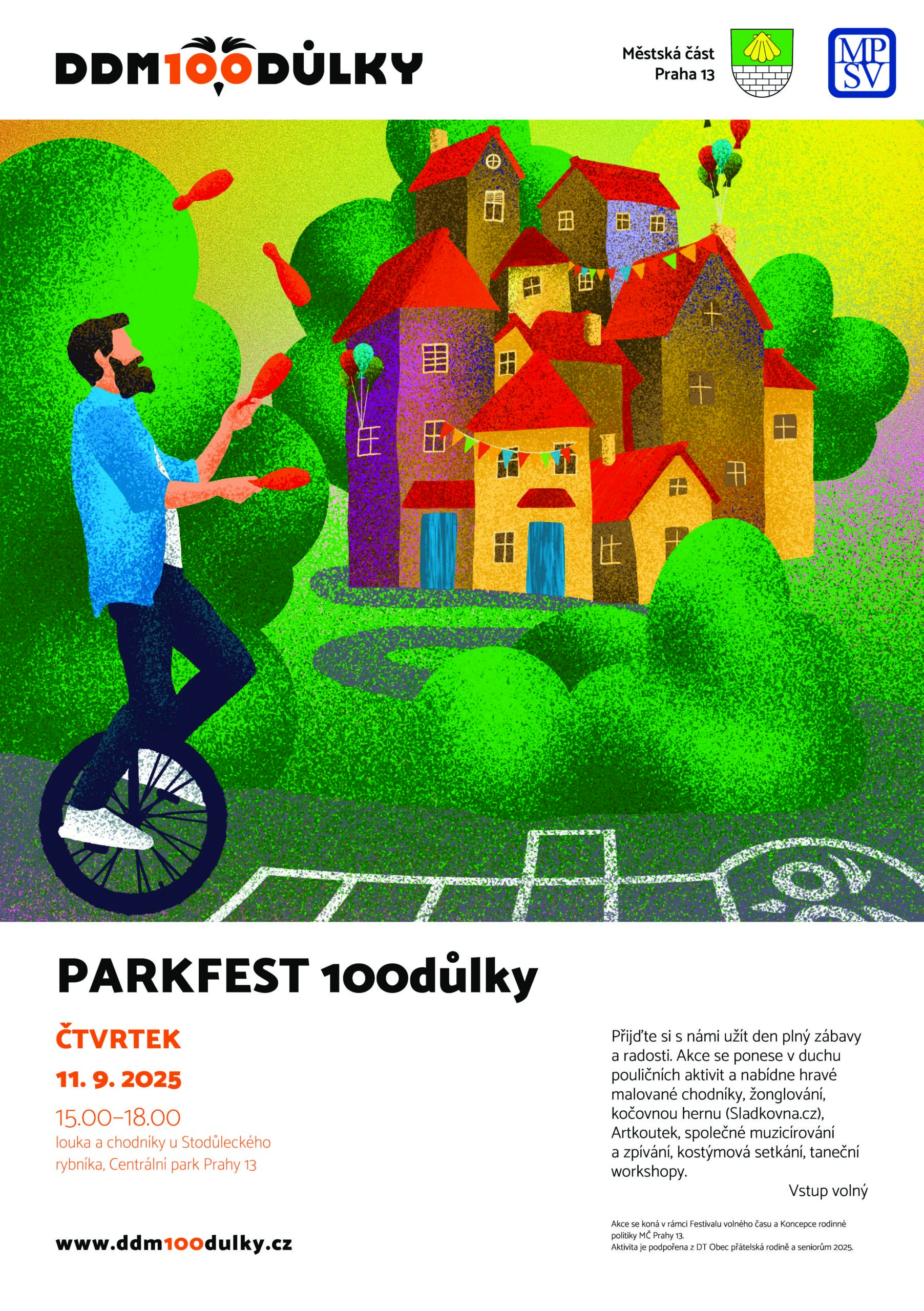 Tradiční akce DDM Stodůlky se ponese v duchu pouličních aktivit a nabídne hravé malované chodníky, žonglování, kočovnou hernu, artkoutek, společné muzicírování a zpívání, kostýmová setkání a taneční workshopy. Bude se odehrávat na stanovištích v Centrálním parku Prahy 13 v okolí Stodůleckého rybníka směrem od ulice U Jezera.