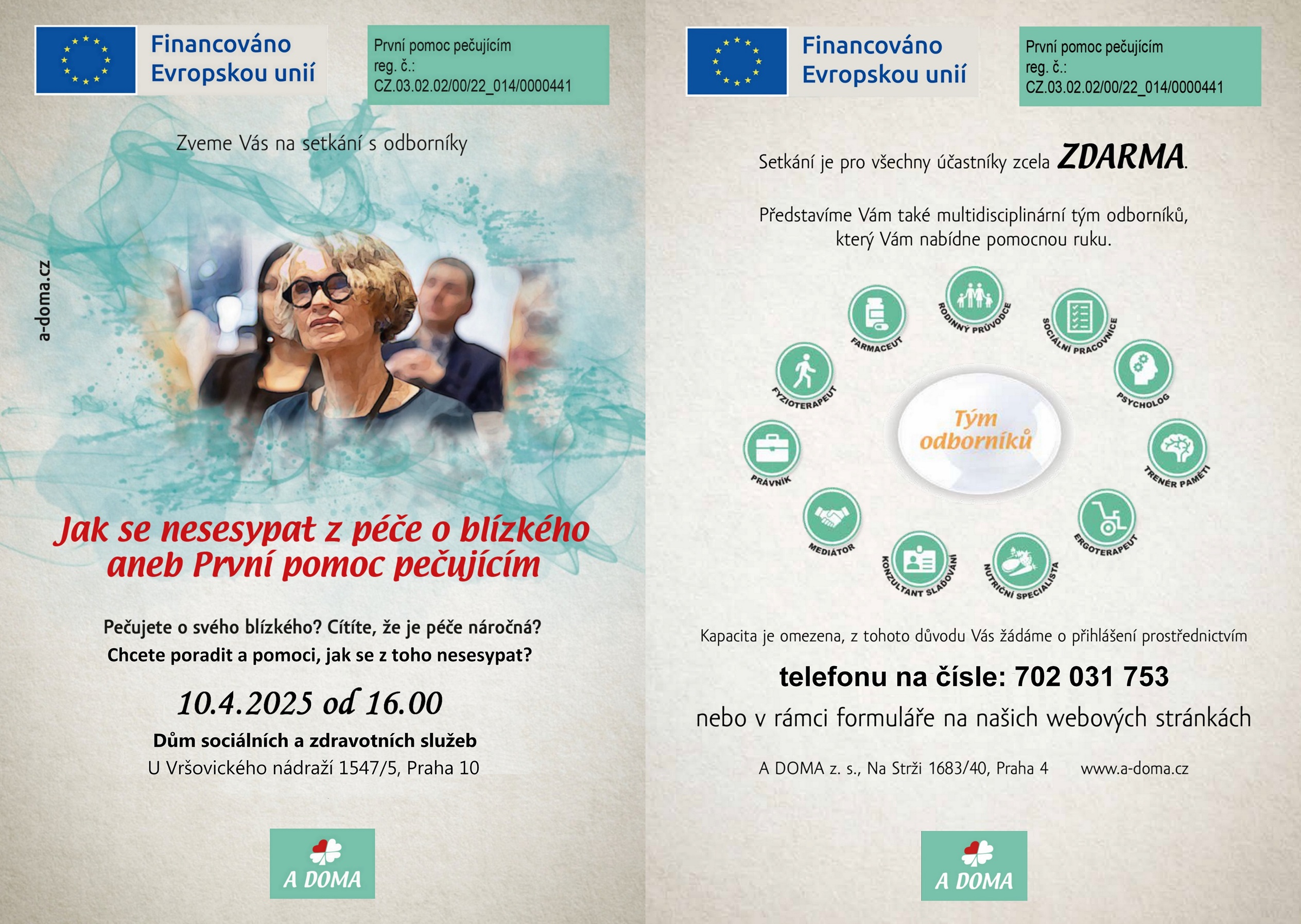 Pečujete o svého blízkého? Cítíte, že je péče náročná? Chcete poradit a pomoci, jak se z toho nesesypat? Pomáháte svým blízkým splnit jejich přání zůstat po zbytek života v domácím prostředí? Jestliže jste alespoň na jednu otázku odpověděli ano, tak následující setkání je určeno právě vám. Setkání je pro všechny zcela zdarma. Představíme vám také multidisciplinární tým odborníků, který vám nabídne pomocnou ruku. Kapacita je omezena, prosíme o přihlášení na tel. 702 031 753 nebo na www.a-doma.cz.