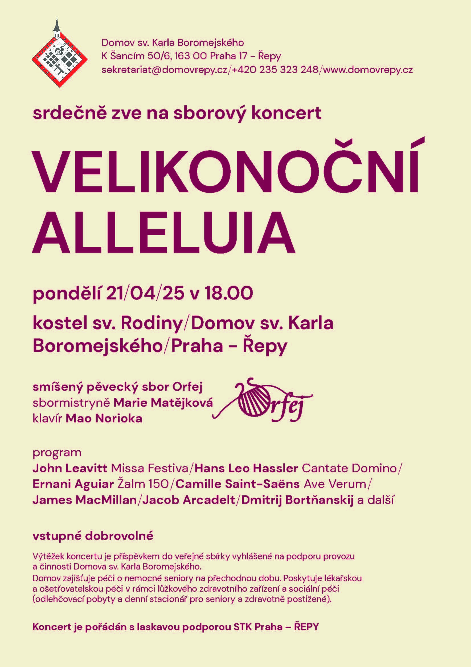 Výtěžek koncertu je příspěvkem do veřejné sbírky vyhlášené na podporu provozu a činnosti Domova sv. Karla Boromejského.