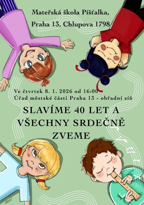 Vedení a kolektiv MŠ Píšťalka si vás dovolují srdečně pozvat na slavnostní setkání u příležitosti 40. výročí založení školy. Těšíme se na setkání.
