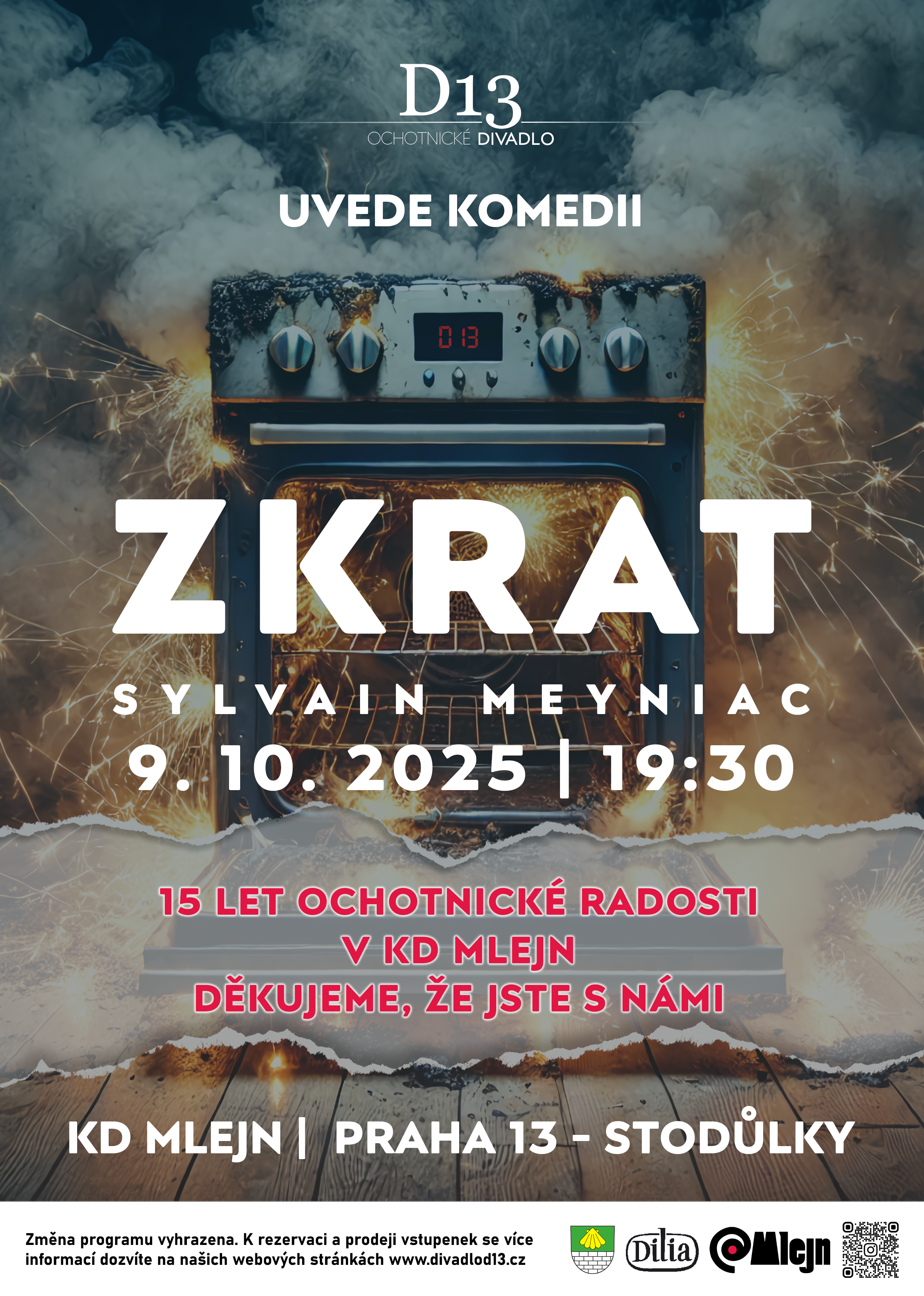 Soubor divadla D13 předvede v KD Mlejn k výročí 15 let od otevření zrekonstruovaného Mlejna komedii Zkrat.