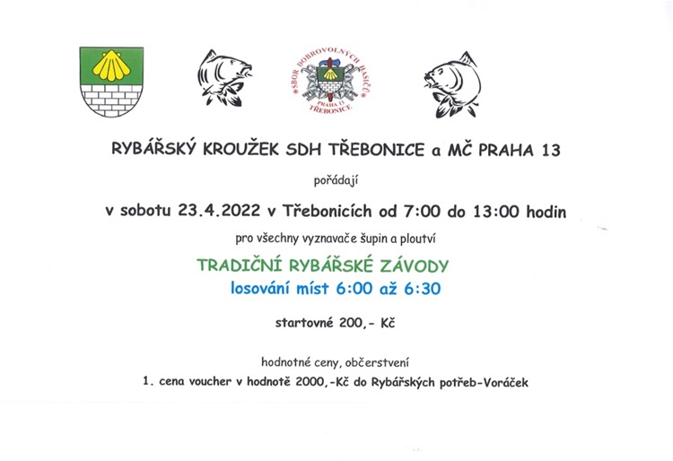 Srdečně vás zveme na Tradiční rybářské závody v Třebonicích. Akci pořádá Městská část Praha 13 a Rybářský kroužek SDH Třebonice.