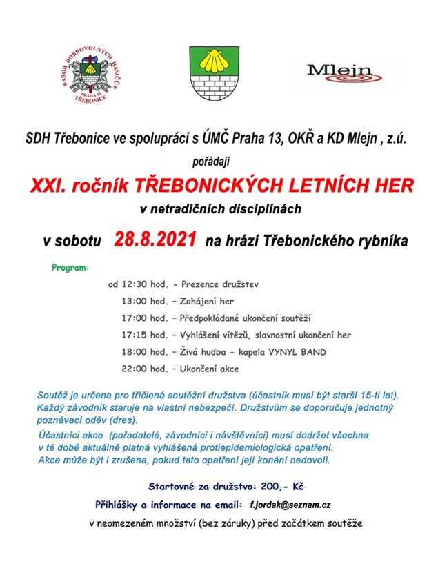 Občerstvení a doprovodný program jsou zajištěny. Hry pořádá Sbor dobrovolných hasičů Třebonice ve spolupráci s Úřadem městské části Praha 13 a Kulturním domem Mlejn. Všichni jste srdečně zváni, pro diváky je vstup zdarma!