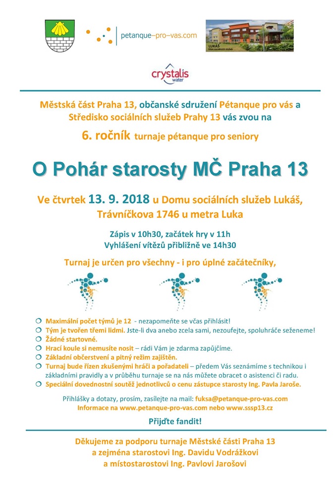 Ve čtvrtek 13. září od 9.30 v Domu sociálních služeb LUKÁŠ. 6. ročník – Turnaj v pétanque o putovní pohár starosty Městské části Praha 13 a zvláštní cenu zástupce starosty pro sociální oblast.