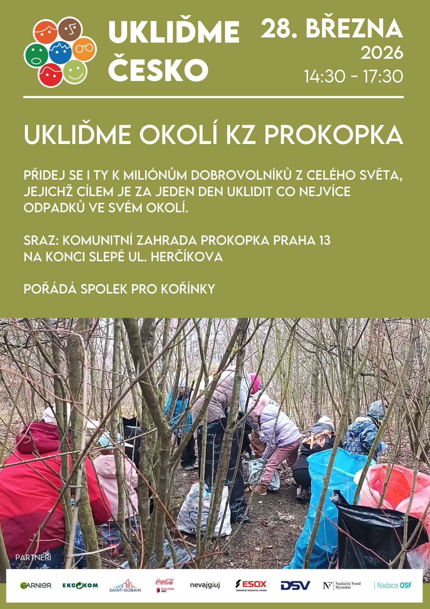 Tato akce spolku Pro kořínky, z.s., je součástí celorepublikové akce Ukliďme Česko 2026. K dispozici budou rukavice a pytle, odvoz odpadu zajistí MČ Praha 13.