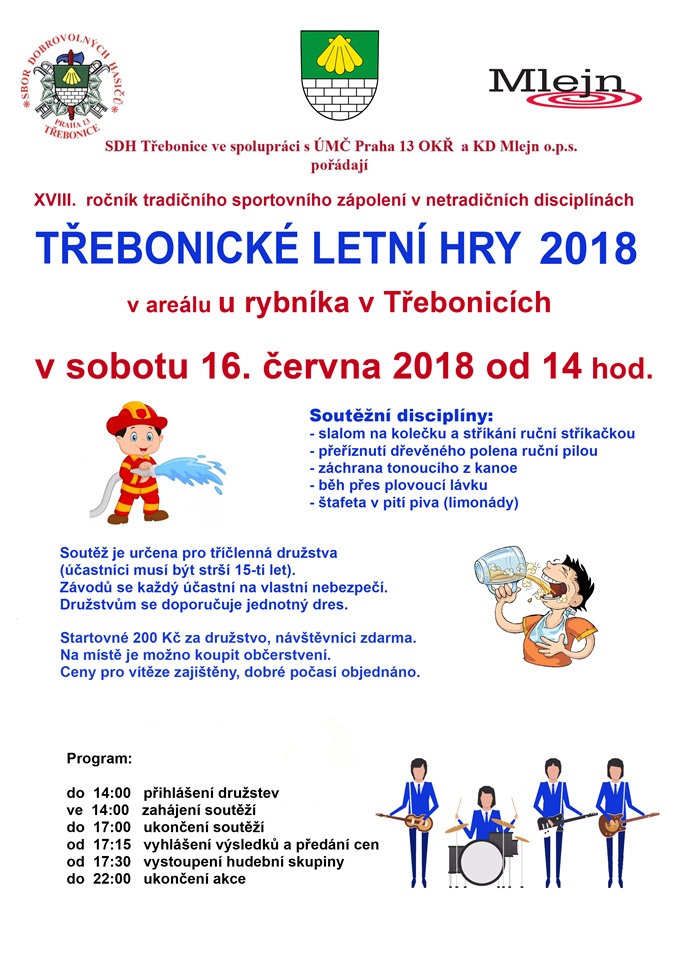 SDH Třebonice ve spolupráci s ÚMČ Praha 13 a KD Mlejn pořádají v sobotu 16. června 2018 od 14 hod. XVIII. ročník tradičního sportovního zápolení v netradičních disciplínách v areálu u rybníka v Třebonicích.