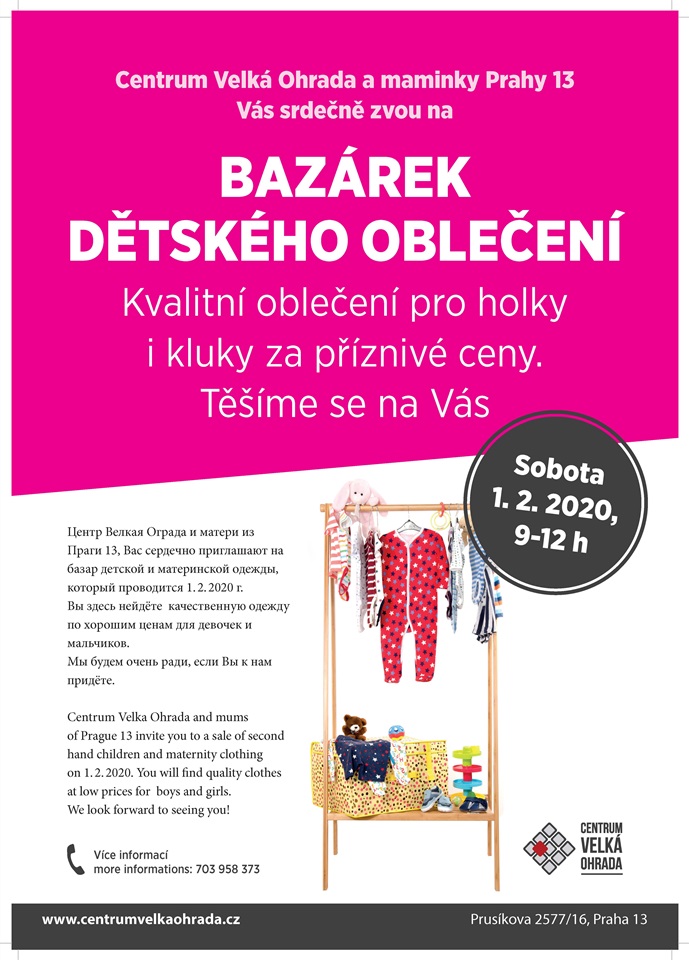 Centrum Velká Ohrada a maminky Prahy13 Vás srdečně zvou v sobotu 1. 2. 2020 od 9.00 do 12.00 na BAZÁREK DĚTSKÉHO OBLEČENÍ.