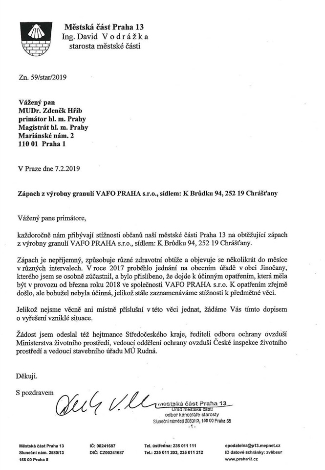 Dopis starosty MČ Praha 13 Davida Vodrážky: