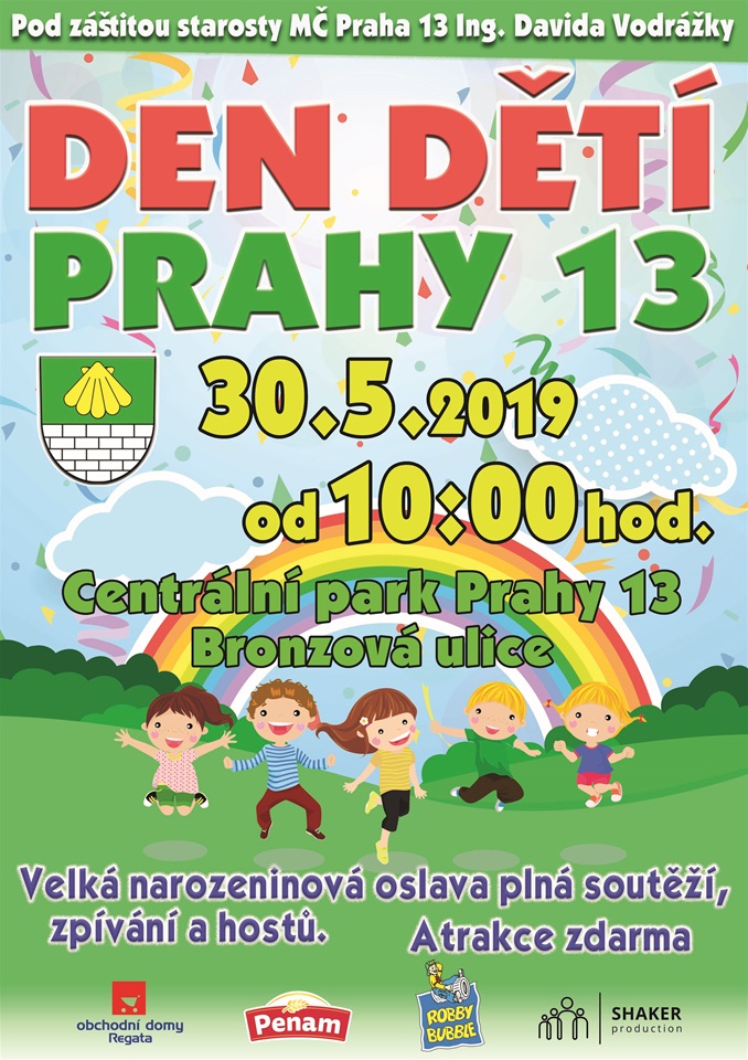 Také letos mohou děti z mateřských a základních škol Prahy 13 oslavit v Centrálním parku (u objektu Bronzová 2572) svůj svátek. Tradičně na ně čeká bohatý program se spoustou zábavy a nejrůznějších dárků. A také pouťové atrakce, cukrová vata a pitíčka zdarma. Oslava končí kolem 12. hodiny. Akce se koná pod záštitou starosty Davida Vodrážky.