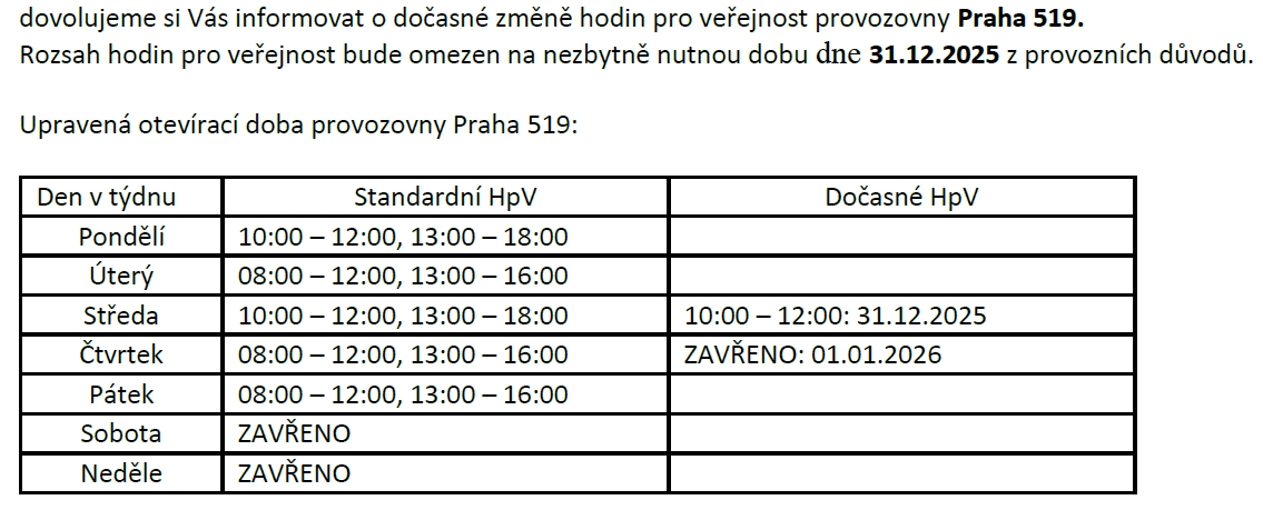 Dočasná změna otevírací doby pro veřejnost České pošty – provozovny Praha 519
