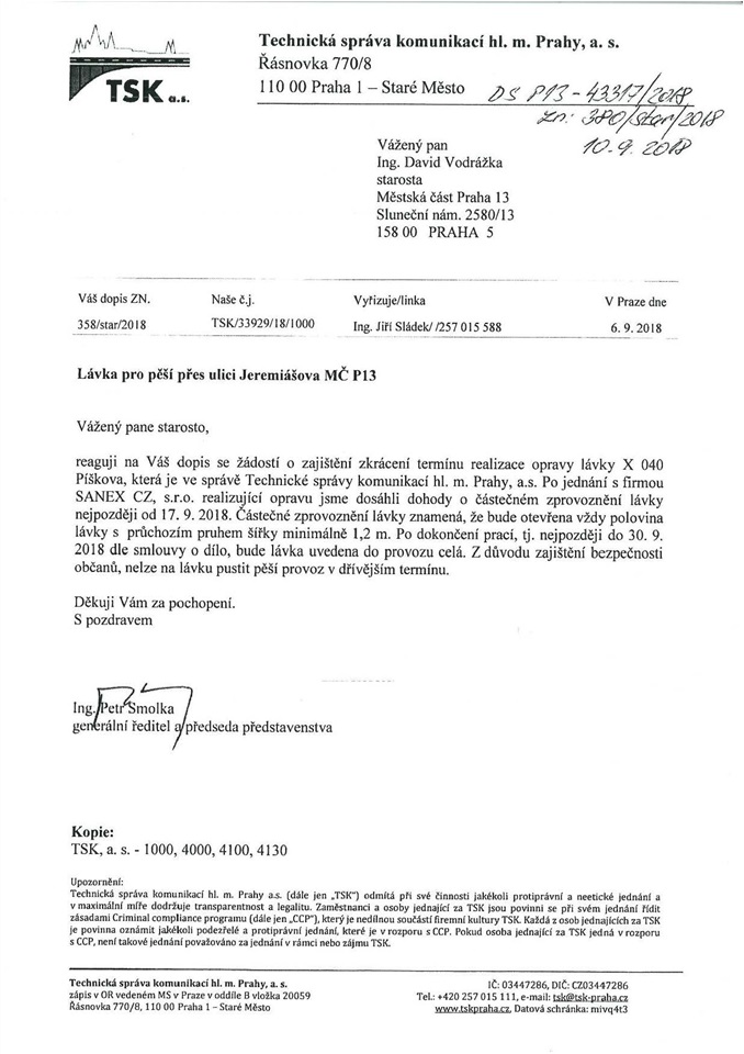 opatření rovněž apelovalo na TSK, aby byl termín oprav zkrácen, jelikož se