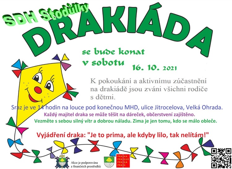 Sbor dobrovolných hasičů Stodůlky pořádá Drakiádu. Každý majitel draka se může těšit na drobný dáreček. Občerstvení zajištěno.