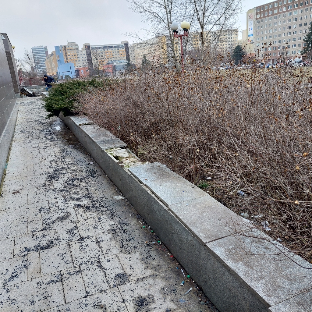 Neustálý nepořádek v zeleni u stanice metra Hůrka a poškozený obklad.