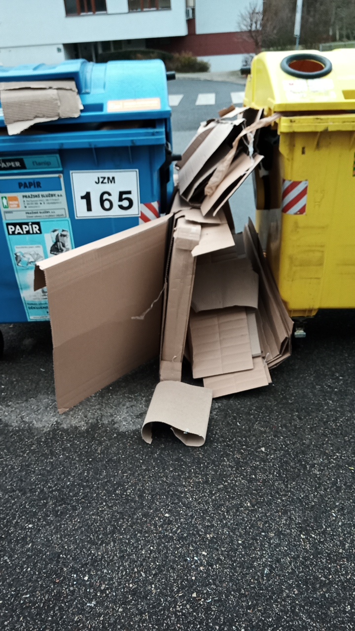 „T“ křižovatka K zahrádkám a Nová kolonie, Tohle už asi nedokážu uklidit. Ráno tam někdo odložil na chodník velkou krabici „Ikea“ a 3 normální velikosti, ty všechny se do kont. ještě vešly. Včera jsem uklidil dvakrát, k první jsem poslal fotky na policii. Máte možnost s tím něco reálně udělat? To můžu psát několikrát do…