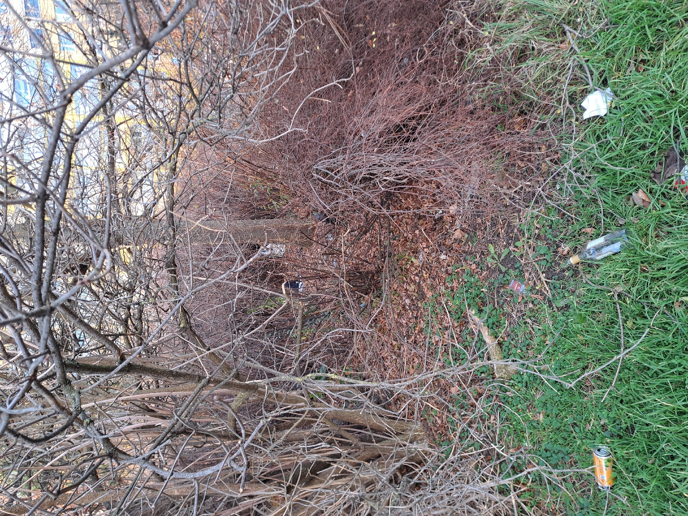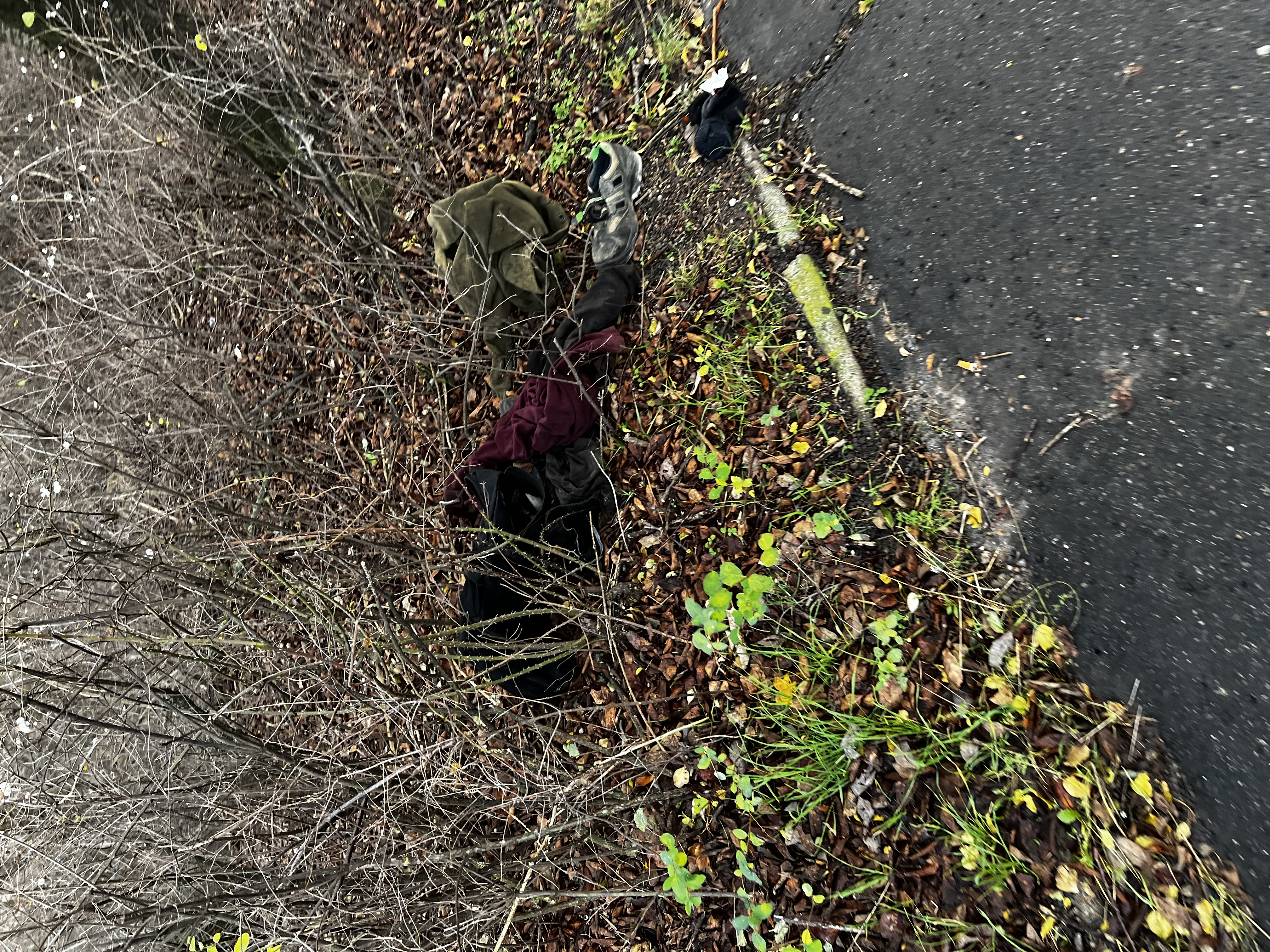 Několik kusu oblečení vedle chodniku, o kus dál vedle lávky přes Oistrachovu je jeste ve křovi kus nábytku