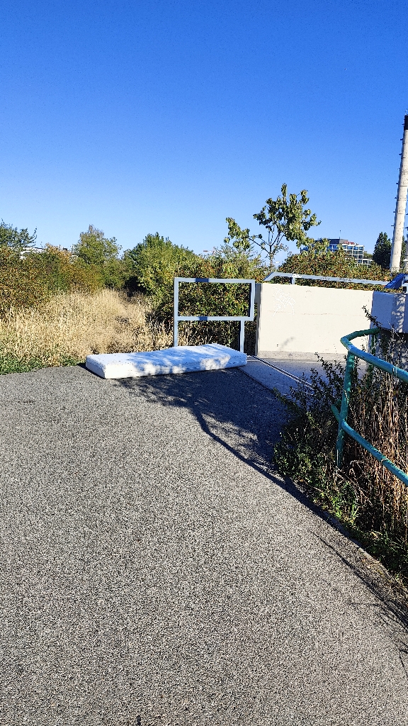 Pohozená stará matrace na chodníku, začátek lávky pro pěší přes ulici Bucharova