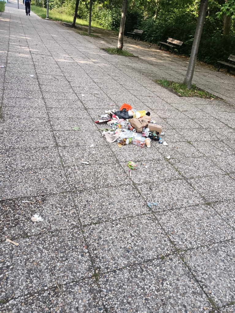 Někdo ze všech košů vysypal odpadky. Když jsem šel na metro, tak už to nějaká starší paní sbírala. Tak možná už to bude uklizeno.
