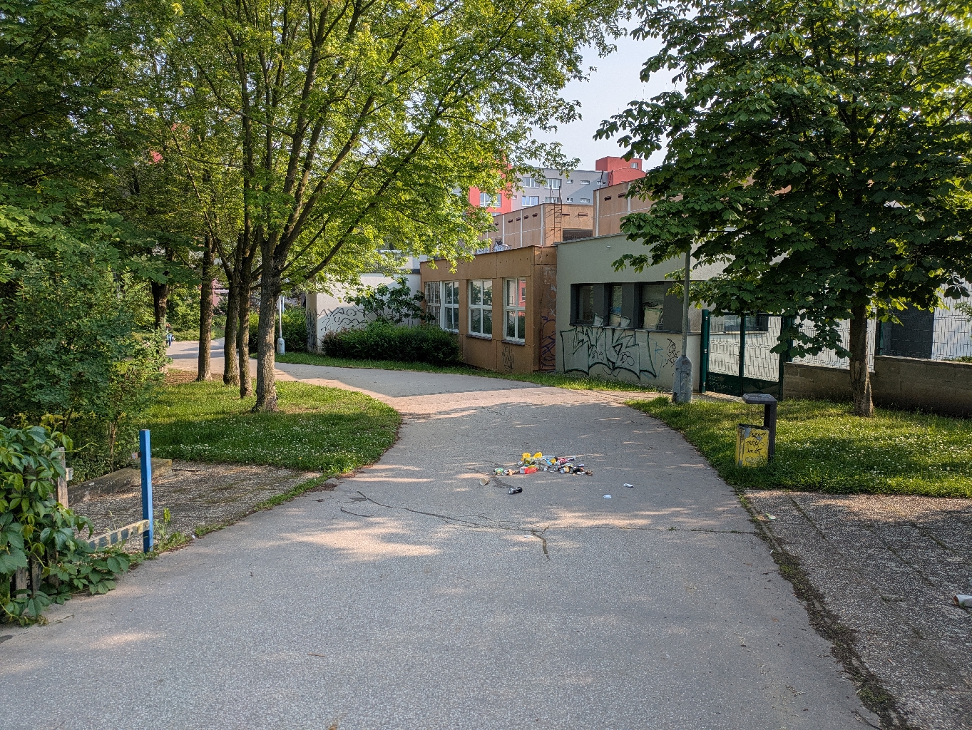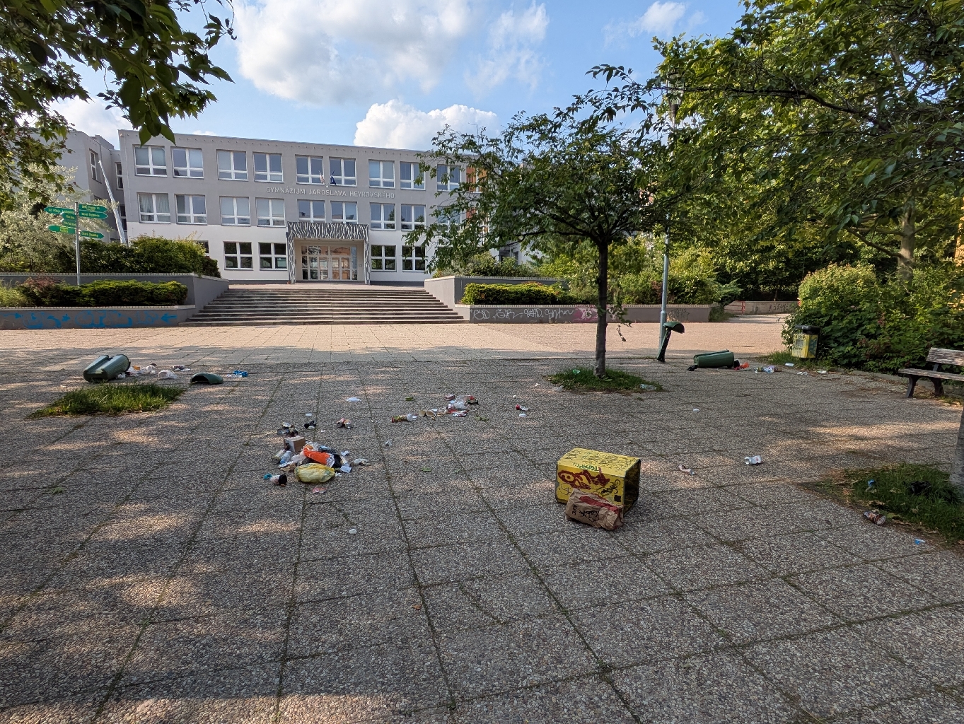poházené odpadkové koše před Gymnáziem Heyrovského