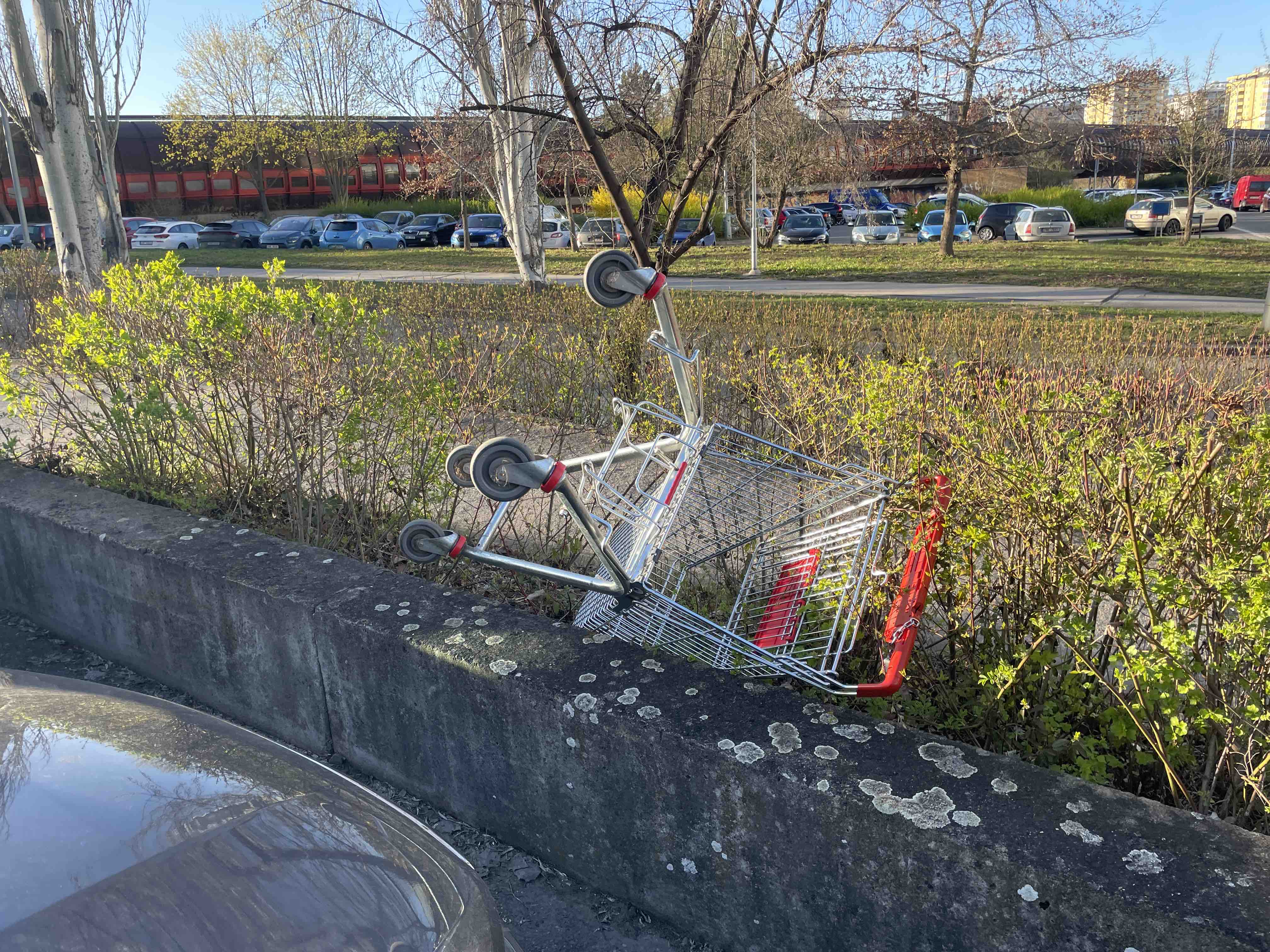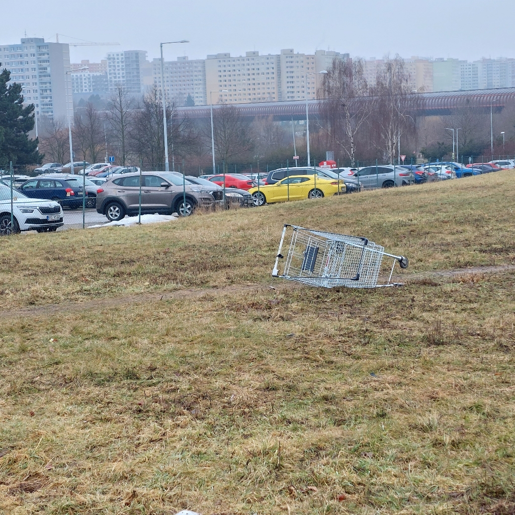 Odložený nákupní košík mezi hlídaným parkovištěm a metrem Hůrka