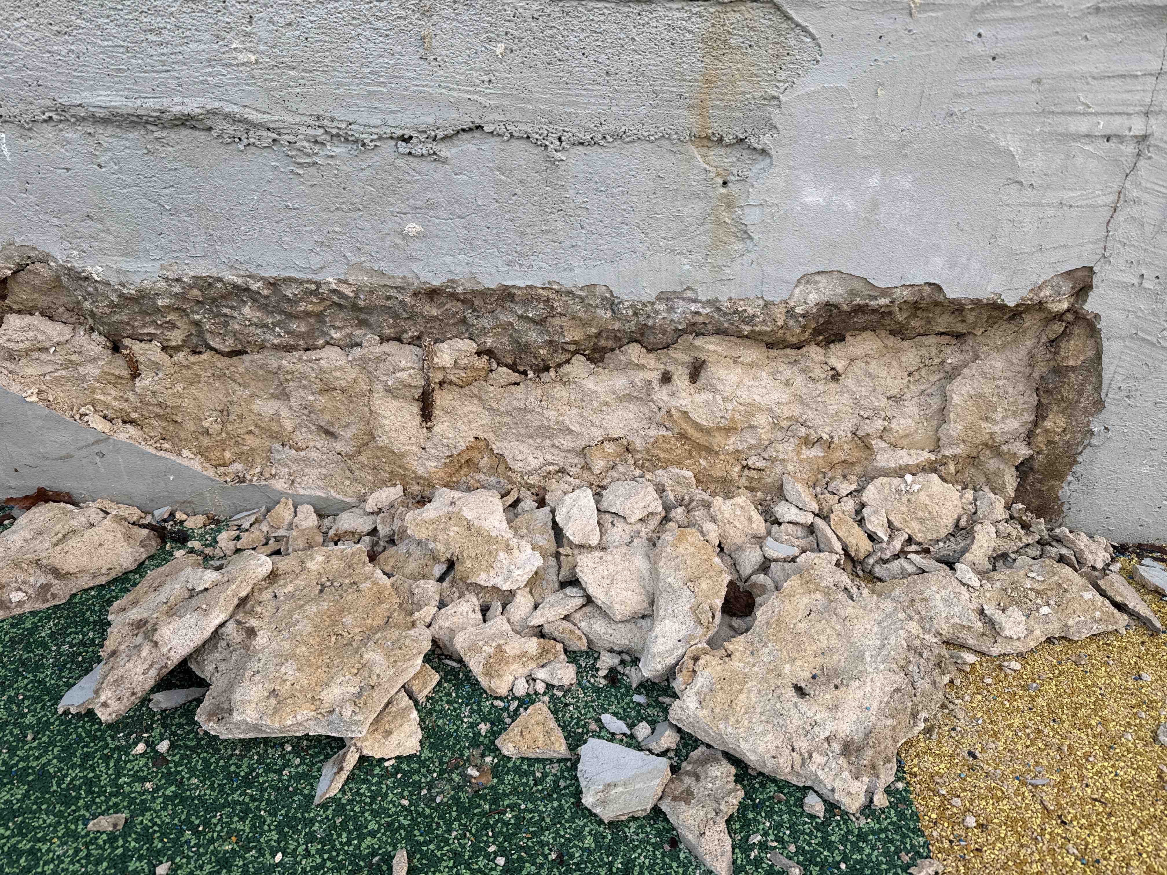 Poškozený betonový základ stěny skateparku / dětského hřiště. Pravděpodobně z podtékání, ze stékající vody z vyššího patra skateparku.