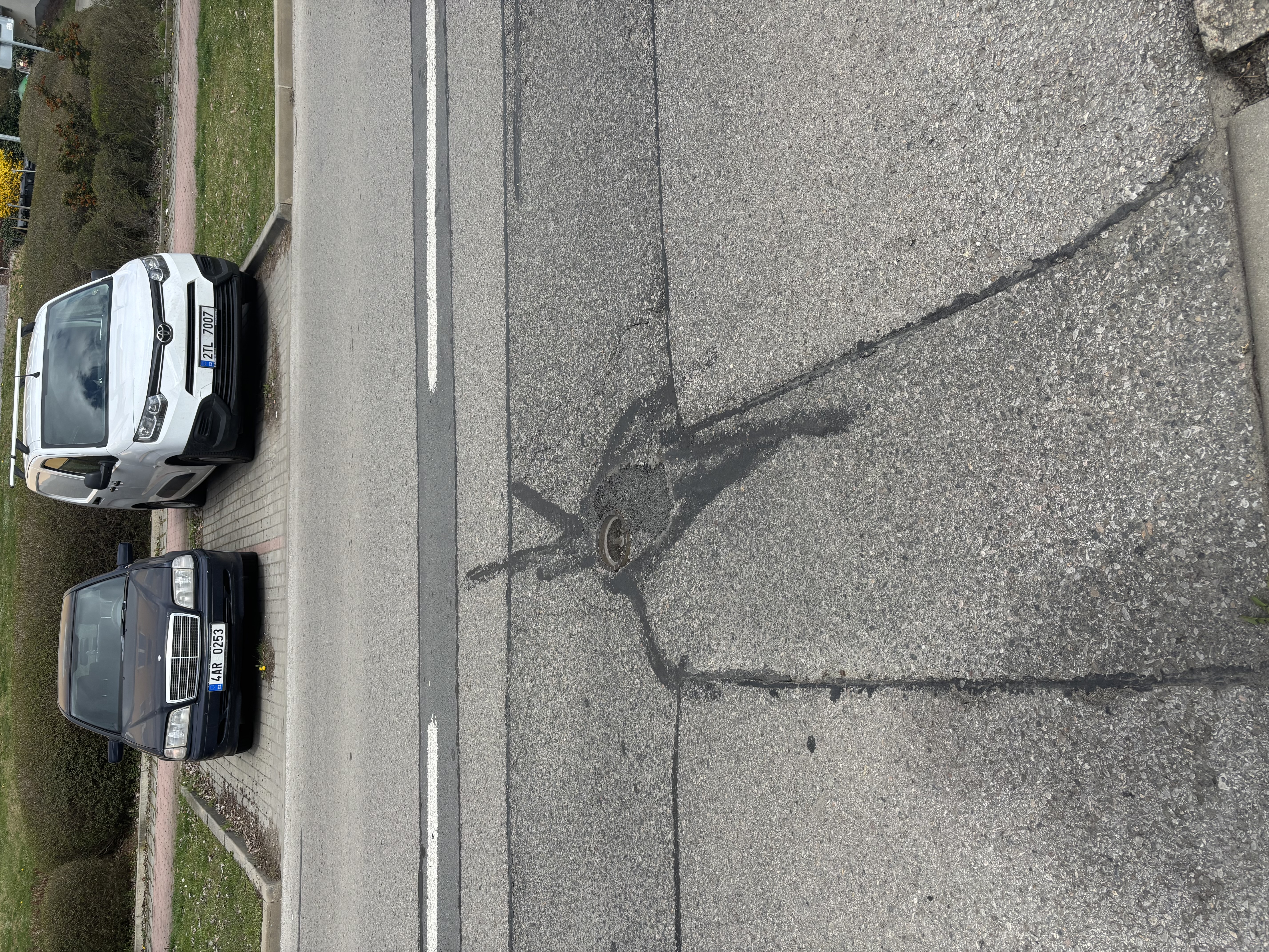 Propadlá vozovka a chybějící víko kanálu. Na první pohled nenápadné, při jízdě v autě ale dost nepříjemné. Prosím o opravu