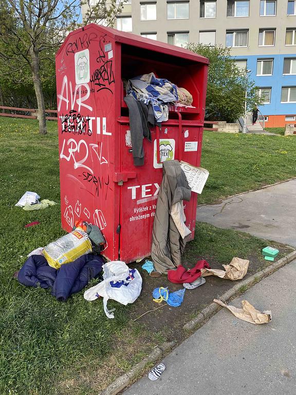Popelnice na tříděný odpad jsou velmi často obklopené zaparkovaným autem a je těžké odpad do popelnice umístit.