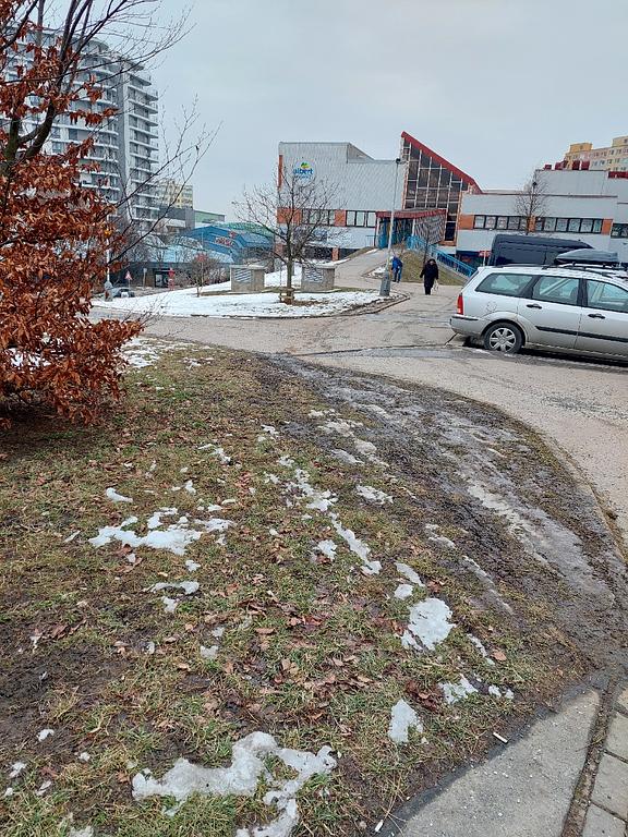 Auta jezdí po trávě, dnes opět nějaká dodávka, která jela ze zhora od nákupního centra jak je posilovna. Je třeba zkypřit hlínu a zasadit semena trávy. Možná hradit, aby tam auta nemohla najíždět.