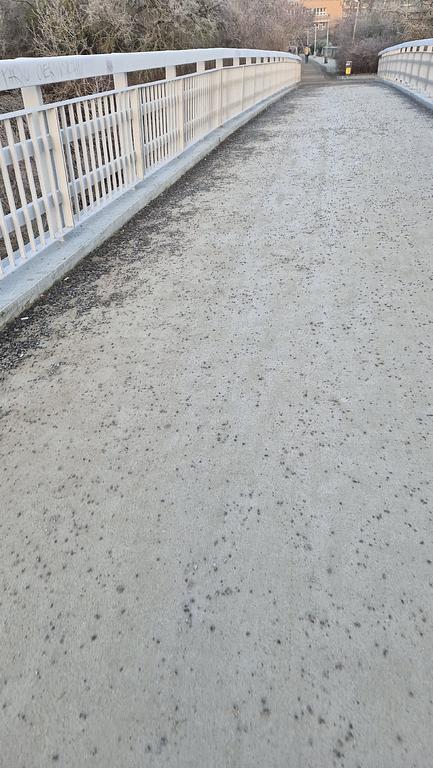 povrch mostu přes Jeremiásovu ulici mezi ulicemi Píškova a Tlumačovská je silně kluzký. Je to velký rozdíl oproti navazujícím cjdoníkům, které jsou zcea v pořadku. Povrch mostu ne kluzký i po slabém letním deštíku, takže při námraze je jeho přechod nebezpečný a pár pohozených kamínků povrch mostu bezpečný nedělá. Samozřejmě by byl nejlepší celoročně bezpečný…