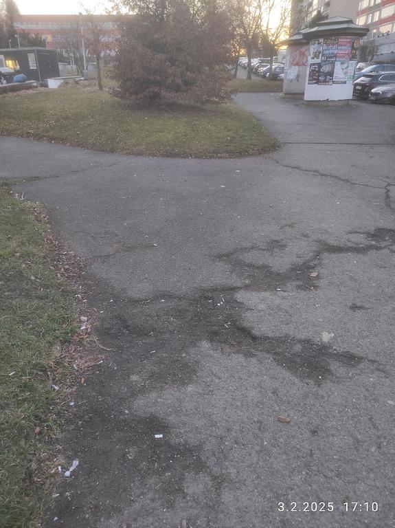 Postup řešení:03. 02. 2025 05:18:12 Dobrý den, Vaše podání bylo postoupeno Technické správě komunikací hl. m. Prahy k zajištění nápravy. 20. 02. 2025 11:32:41 Chodníky se za těchto mrazivých dnů nemohou opravit. Situace bude prověřena za lepších klimatických podmínek.