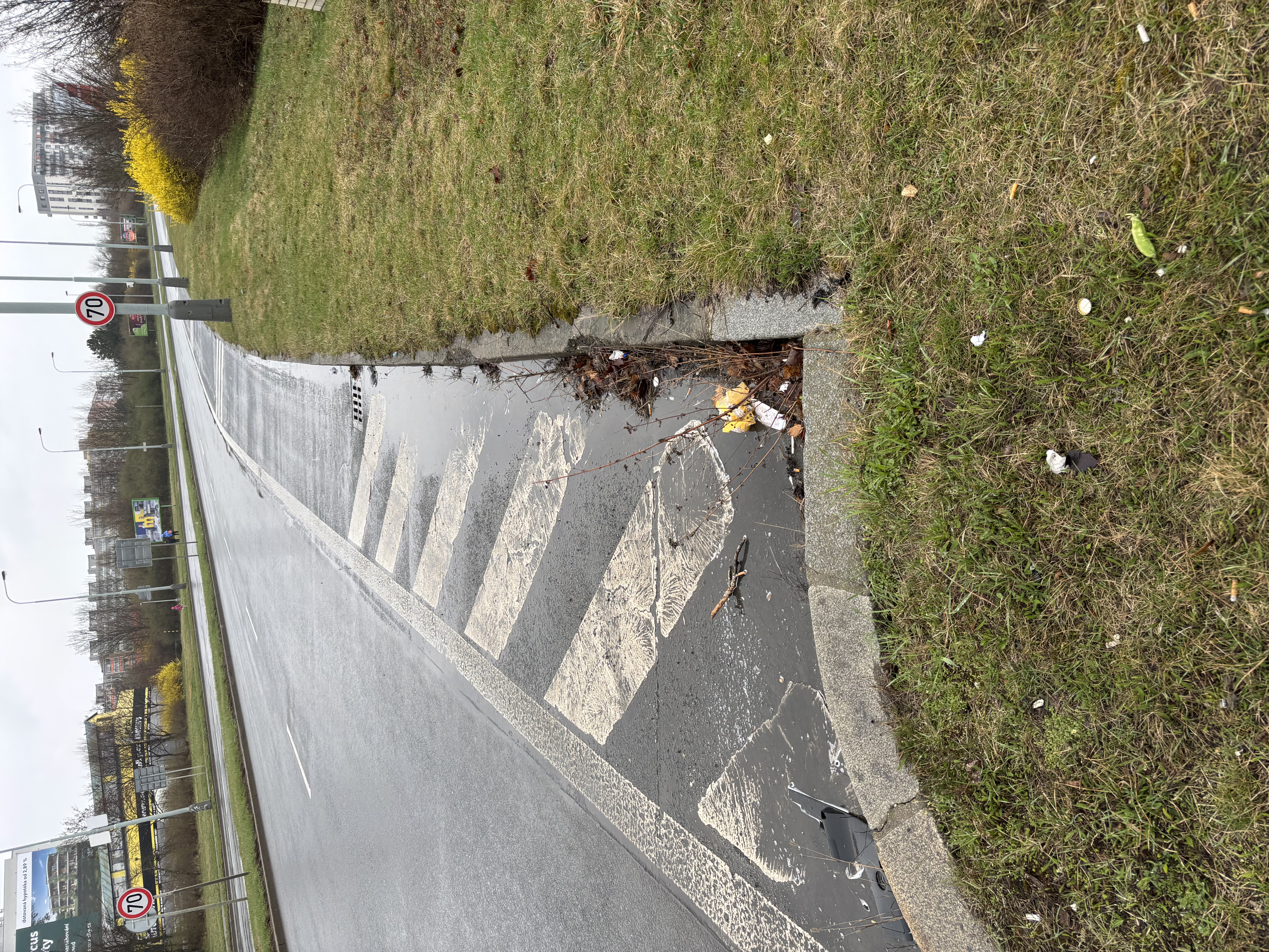 odpadky u kraje silnice a uprostřed na dopravním ostrůvku