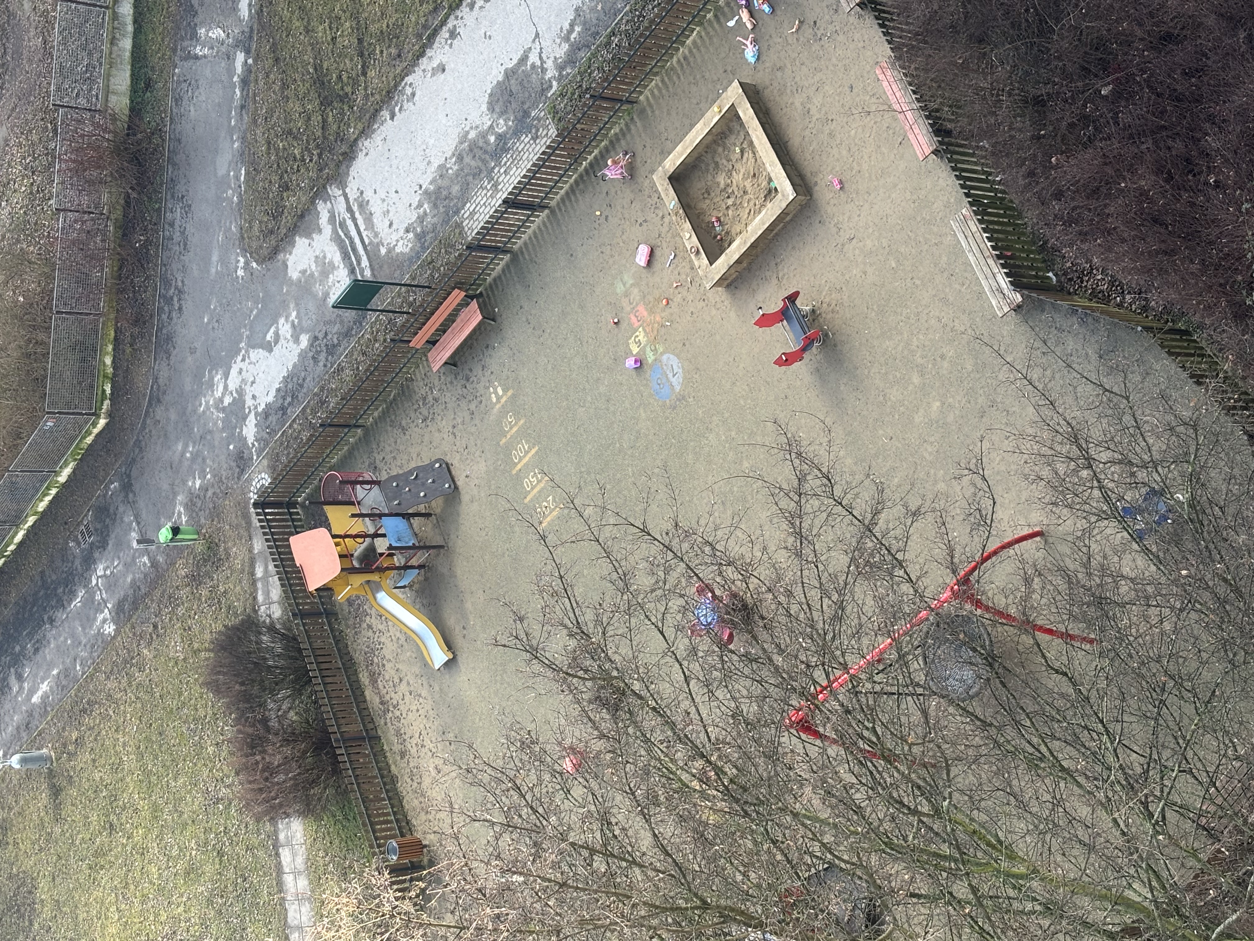 Po celém hřišti jsou nahnilé listy a písek, který je smíchaný s listy a bahnem. V pískovišti je písku úplné minimum. Ale větší starost je ten nepořádek