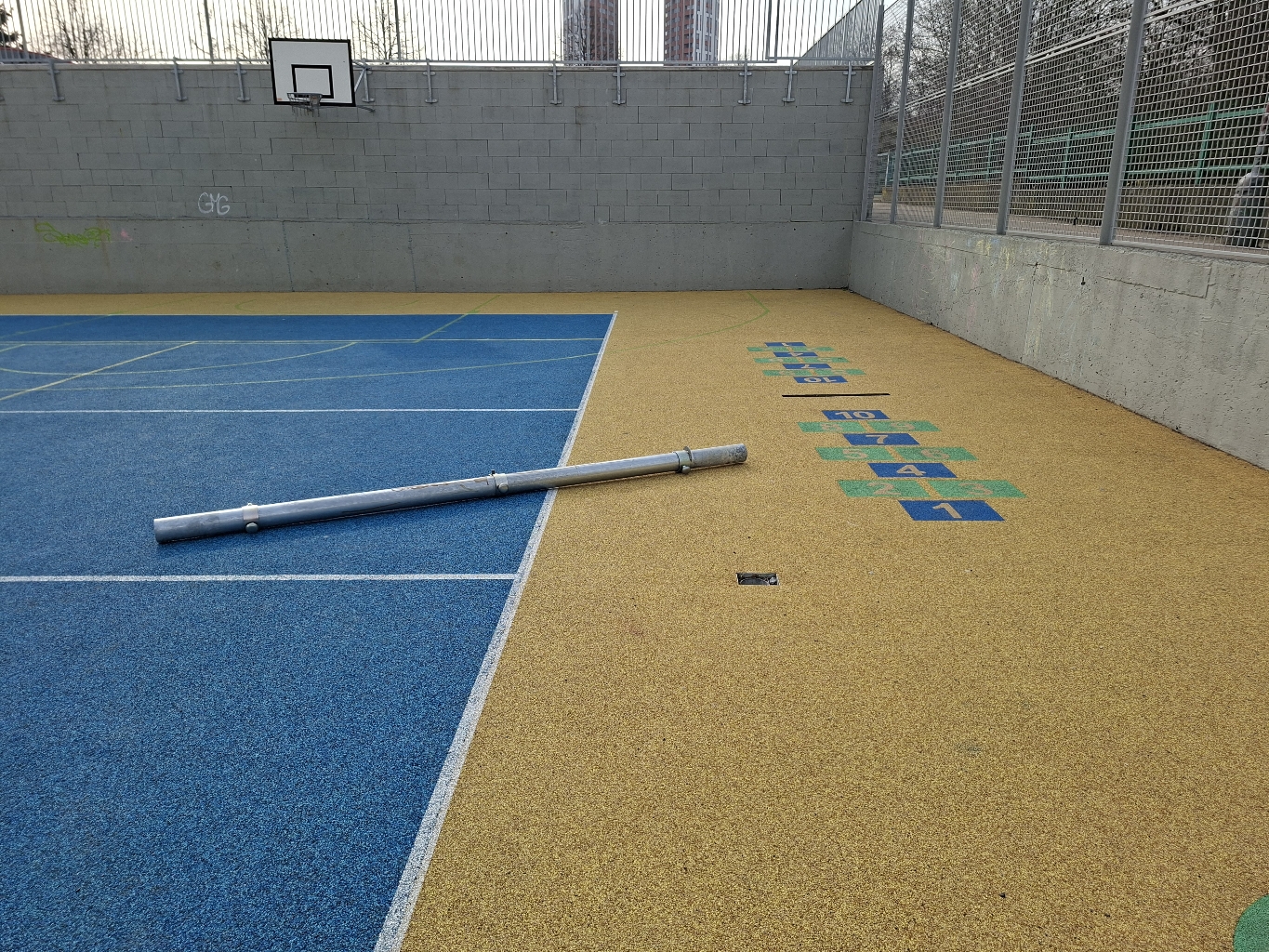 Na hristi ve vnitrobloku je drobne poskozena vývrtková skluzavka na dětském hřišti u skluzavky