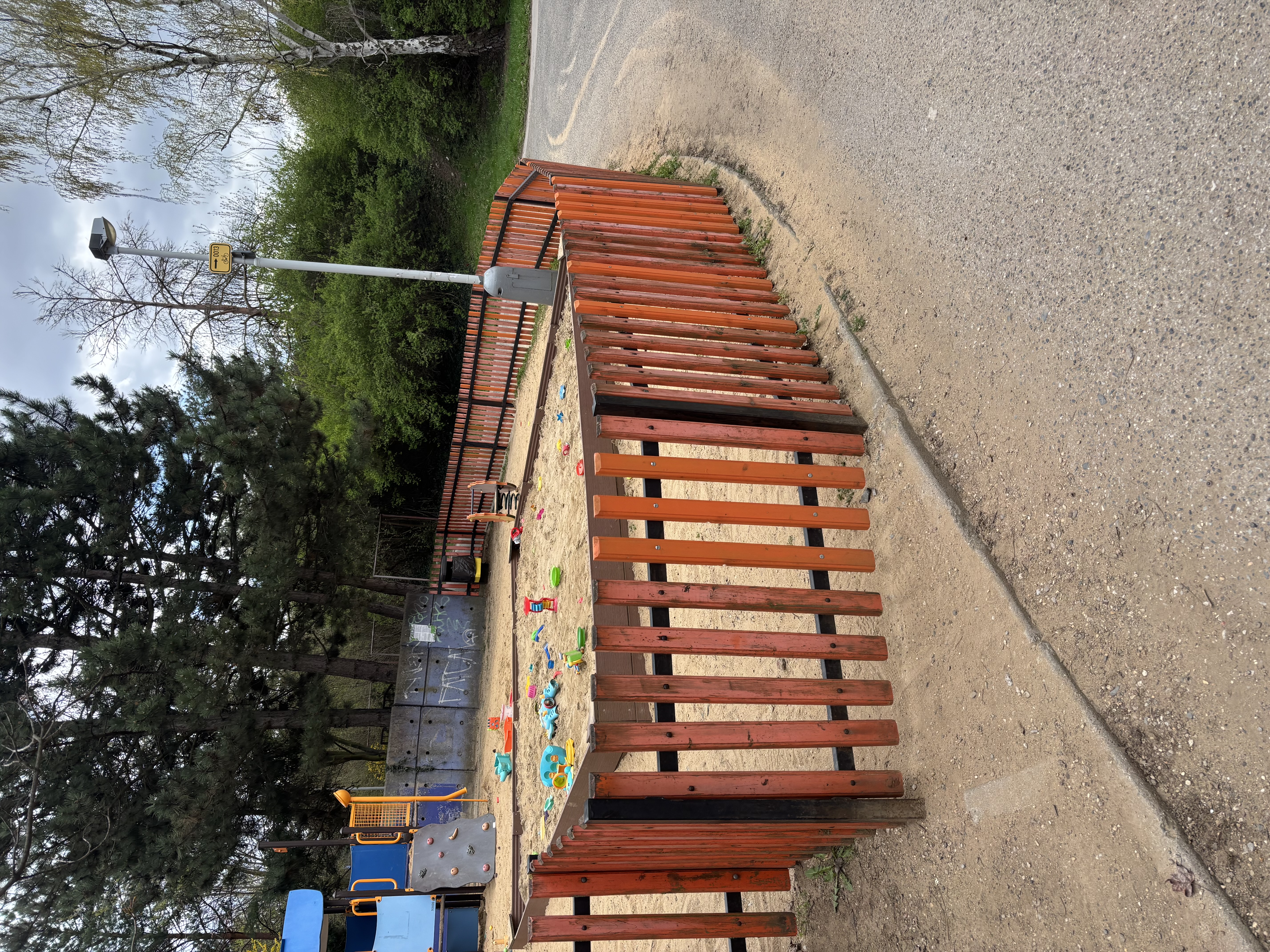 Hřiště nemá žádný obrubník, nebo zábranu, takže při sebemenším dešti je z něj písek vyplavován na přilehlý chodník
