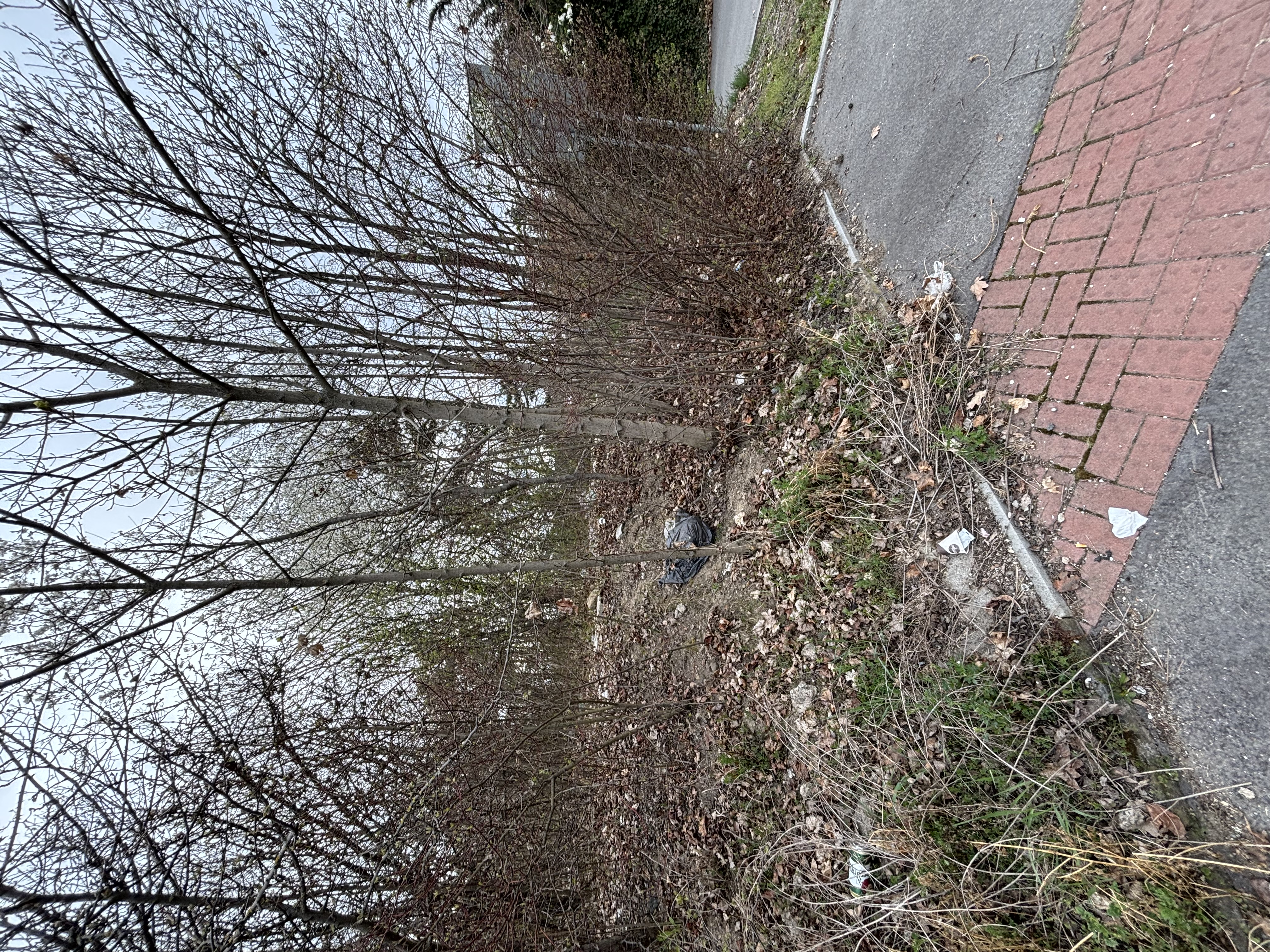 Odpadky poházené ve křoví na rohu ulic Sárská a Vstavačová, pozemek č. 262/46, k. ú. Stodůlky