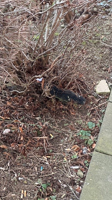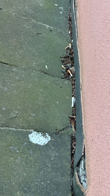 prosím o úklid hromady nedopalků, dalšího nepořádku (např. lahev od alkoholu, násada od koštětě, atd.) u vchodu Neustupného 1839/8 včetně přilehlého křoví. 50.0440075N, 14.3215858E, 50.0440108N, 14.3216717E. Foto v příloze. Foceno 10.2. odpoledne.