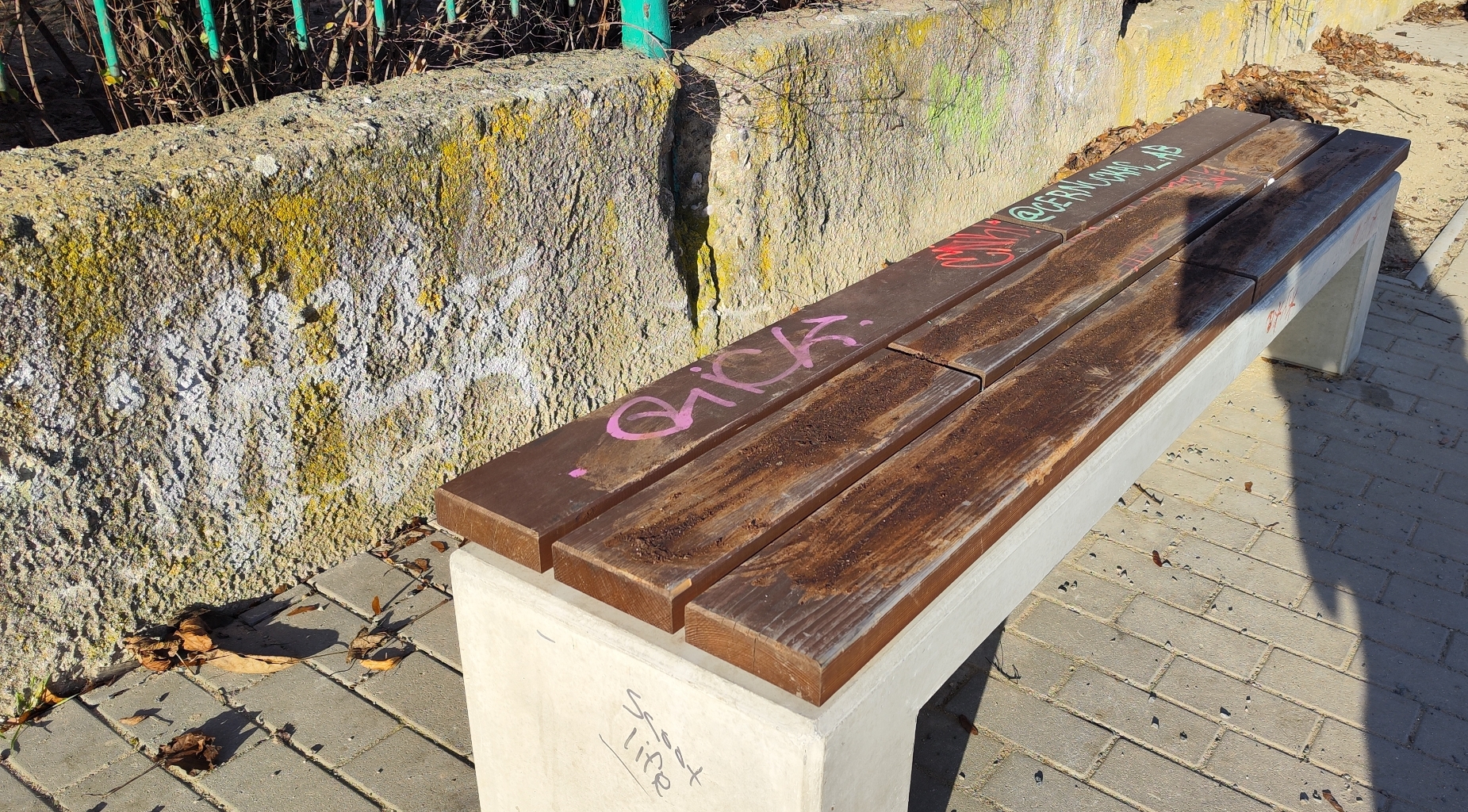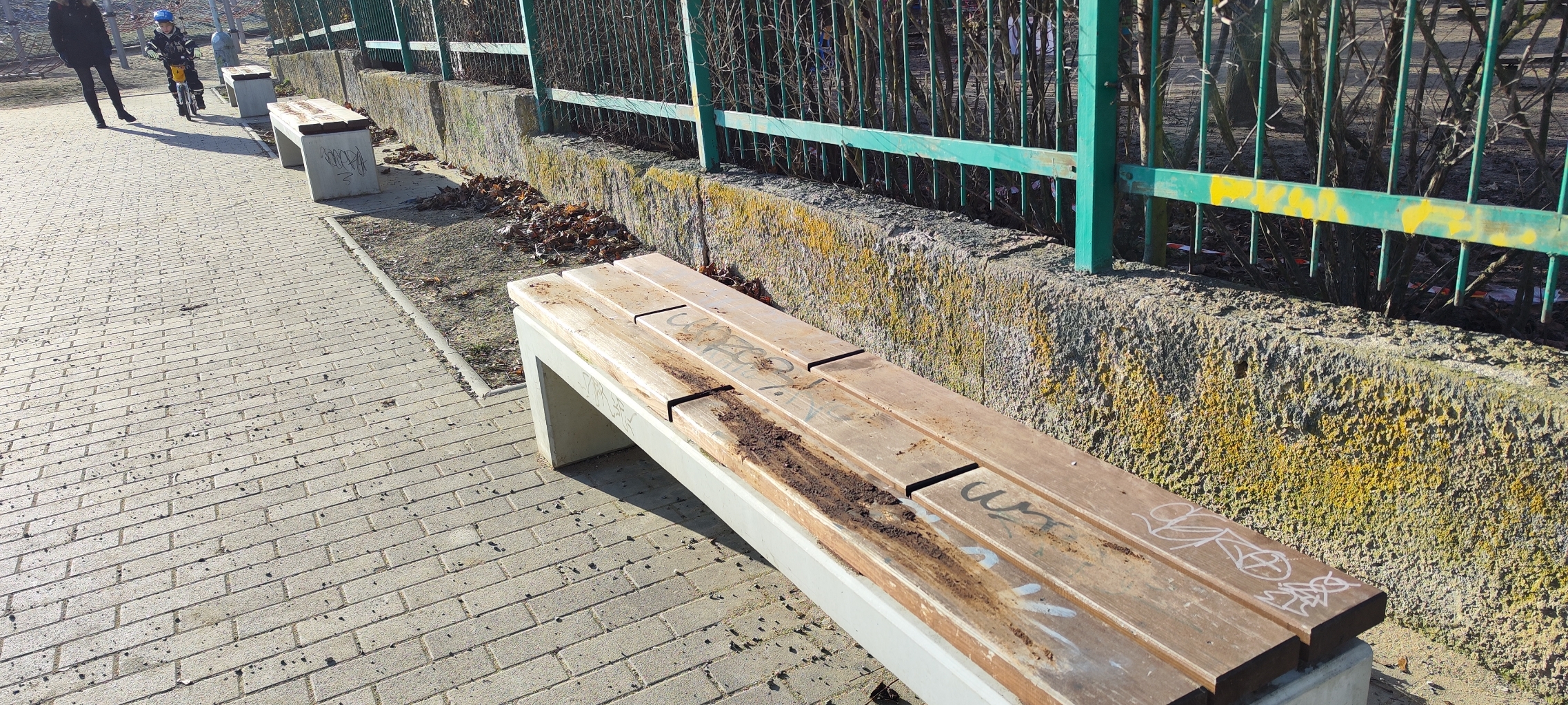 Prosím, o vyčištění laviček od výkalů. Bylo by dobré umístit KS, a dále všechny lavičky i naproti dětskému hřišti a pískovišti, natřít světlou barvou, aby lidé se špatným zrakem nebo barvoslepý – okamžitě měli informaci o znečištění.