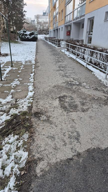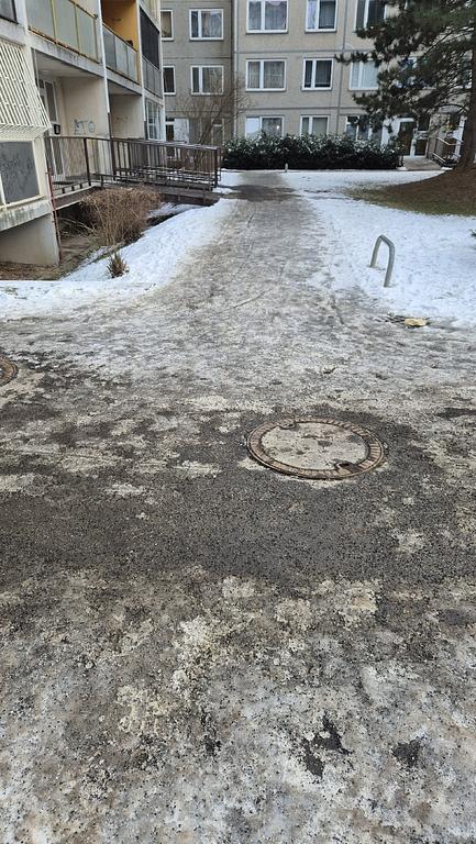 Bohužel je to ve stinné části vnitrobloku a posypová sůl účinkuje až od -6 st.C. Tak to snad už povolí.