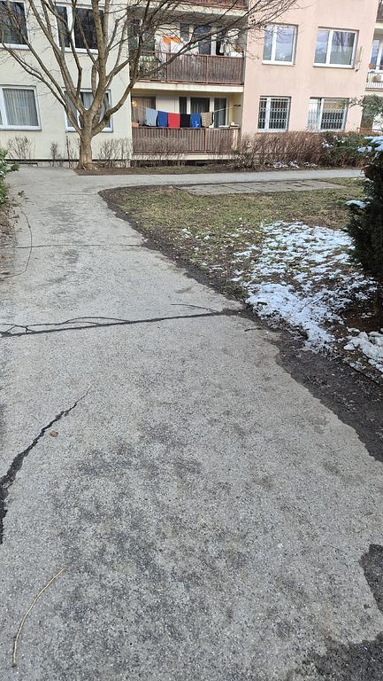 Přístupová cesta k domu Borovanského 2377 ve vnitrobloku, která je jedinou bezbariérovou cestou do domu, kde bydlí vozíčkář, je opět jako jediný úsek v celém vnitrobloku pokryta silnou vrstvou hrbolatého ledu. Ostatní cesty ve vnitrobloku jsou bezvadně uklizeny. Takový terén je pro vozíčkáře téměř nesjízdný