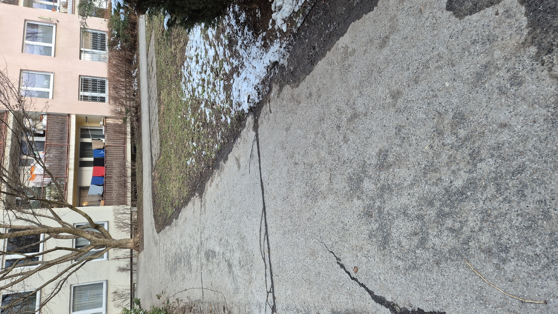 Přístupová cesta k domu Borovanského 2377 ve vnitrobloku, která je jedinou bezbariérovou cestou do domu, kde bydlí vozíčkář, je opět jako jediný úsek v celém vnitrobloku pokryta silnou vrstvou hrbolatého ledu. Ostatní cesty ve vnitrobloku jsou bezvadně uklizeny. Takový terén je pro vozíčkáře téměř nesjízdný