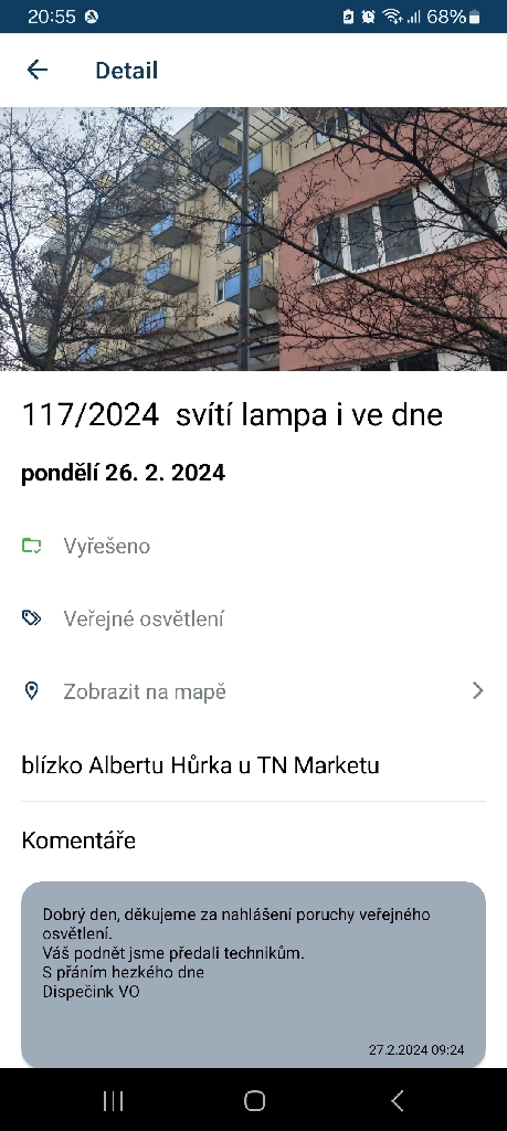 Dobrý den, Vámi nahlášena závada byla znova postoupena správci veřejného osvětlení k zajištění nápravy.