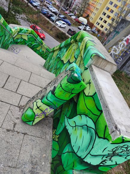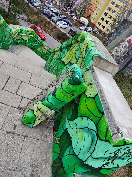Uvolněné betonové zábradlí (grafiti) v ulici Zázvorkova x Modrá je již opraveno.
